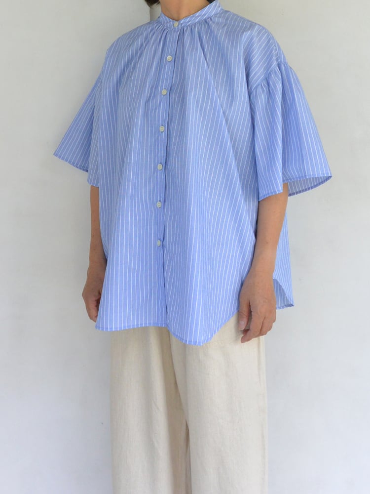 薄手ながら透け感はなく、ハリのある風合いにきれいな表面感でさらっとした肌ざわりが特徴のコットンブロード生地を使用したストライプ柄のブラウス