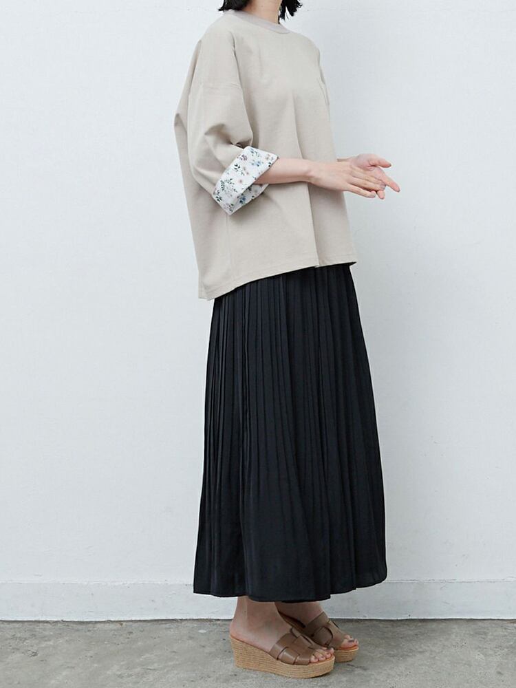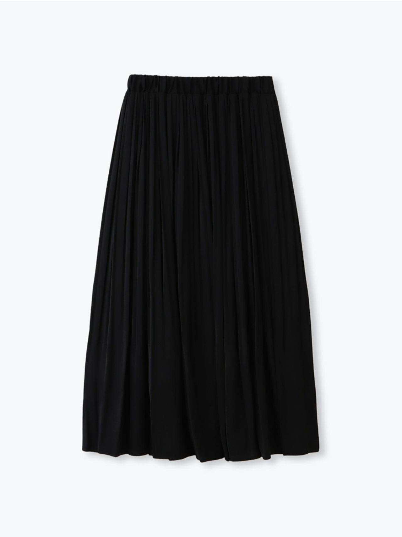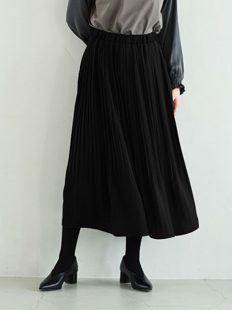 ウエストは総ゴム仕様で裏地も付いており、裾のプリーツを消すことで女性らしいシルエットと軽やかな動きの出るオールシーズン愛用できる万能アイテムです。