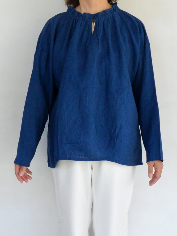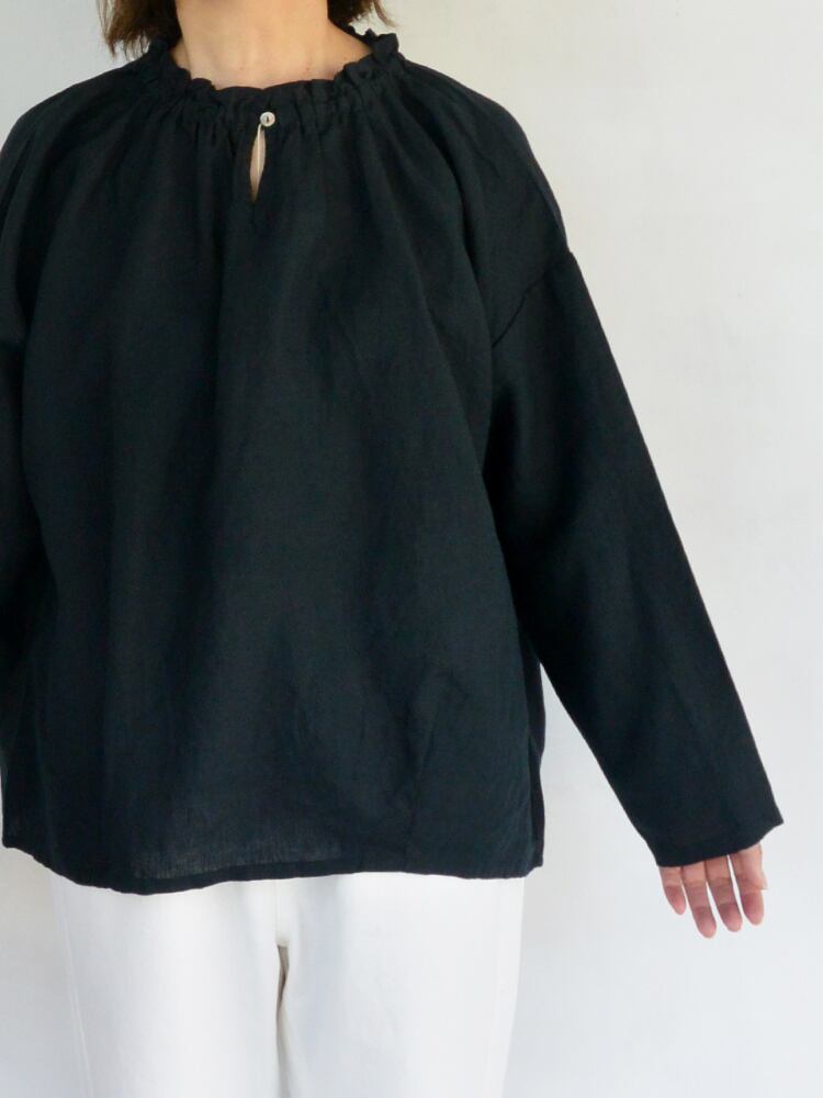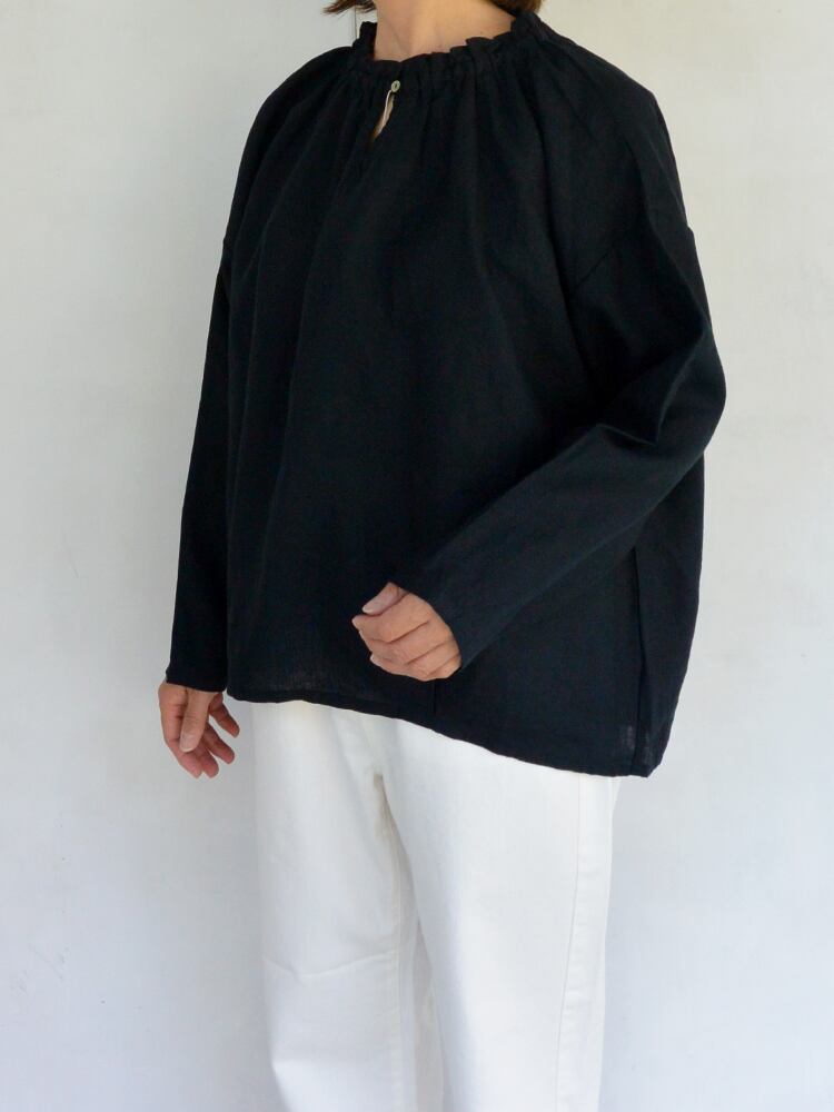 首元のフリルと繭のように丸みがあり、裾に向かって立体的なシルエットが特徴のブラウス。