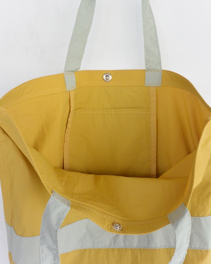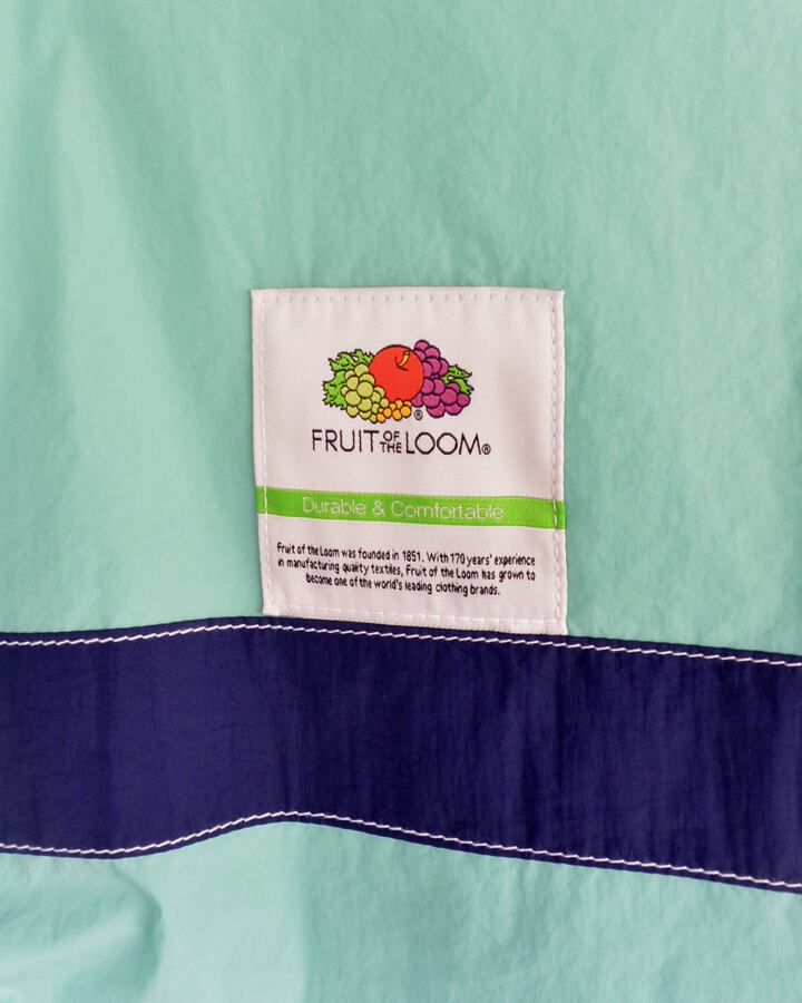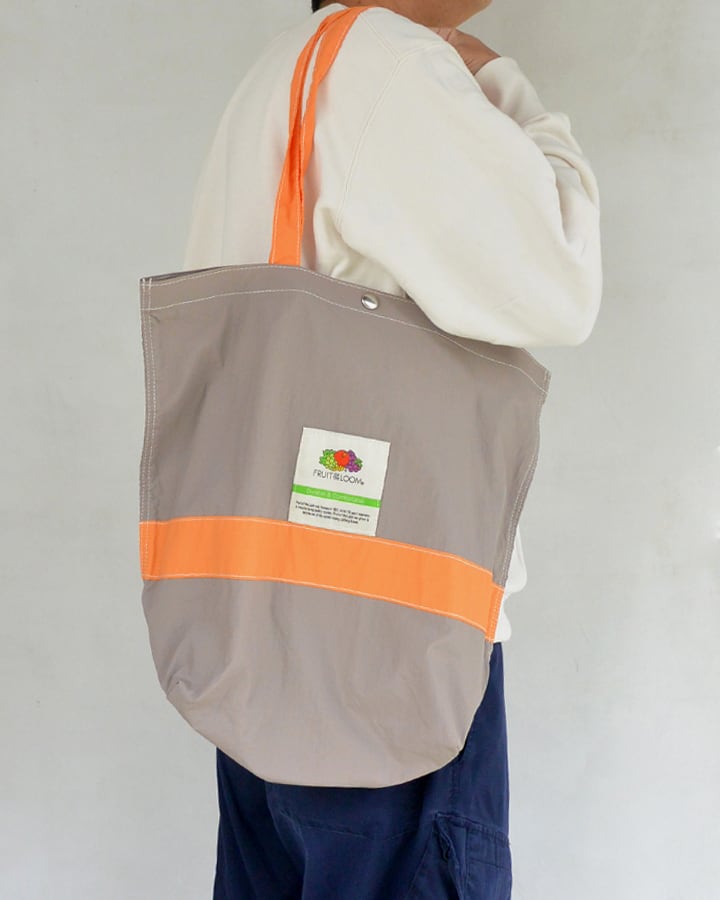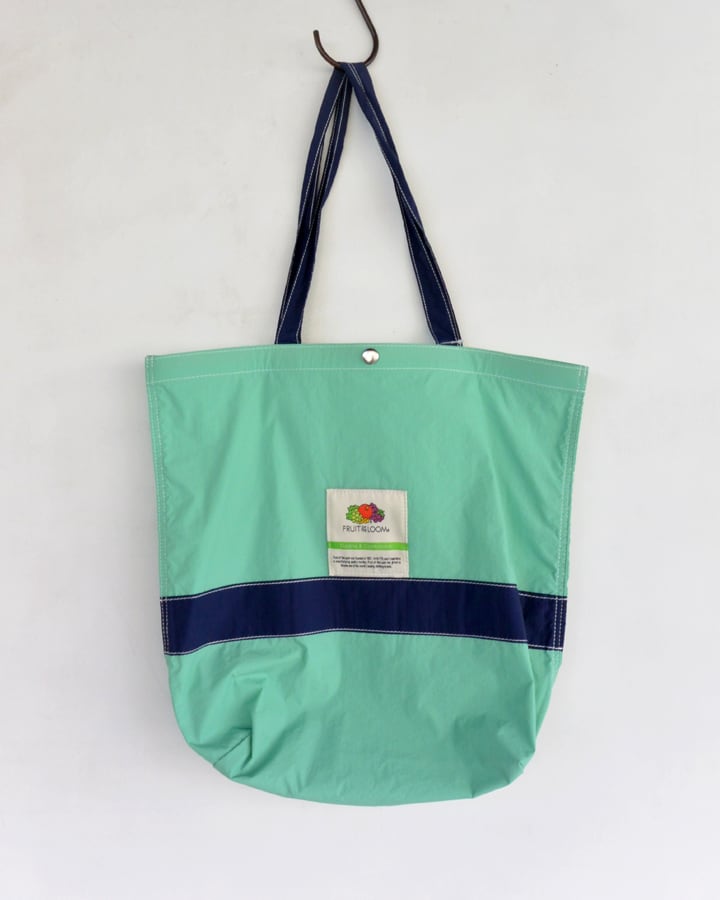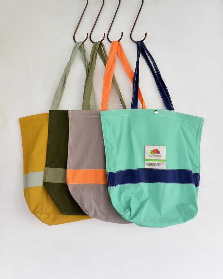 カラフルな生地にフルーツのロゴがかわいいナイロントートバッグ。