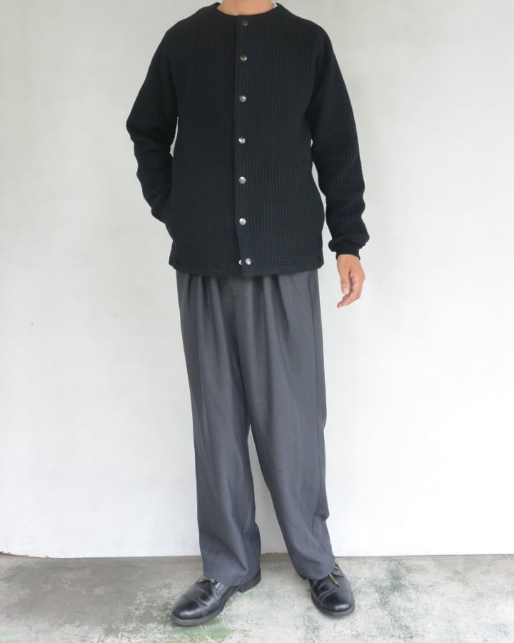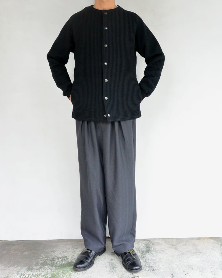 インナー使いにもしやすいようにシンプルなすっきりとしたシルエットに仕上げられていますが、スナップ釦を採用し、両脇にはインシームポケットも付いているので1枚でアウターとしても着用頂けます