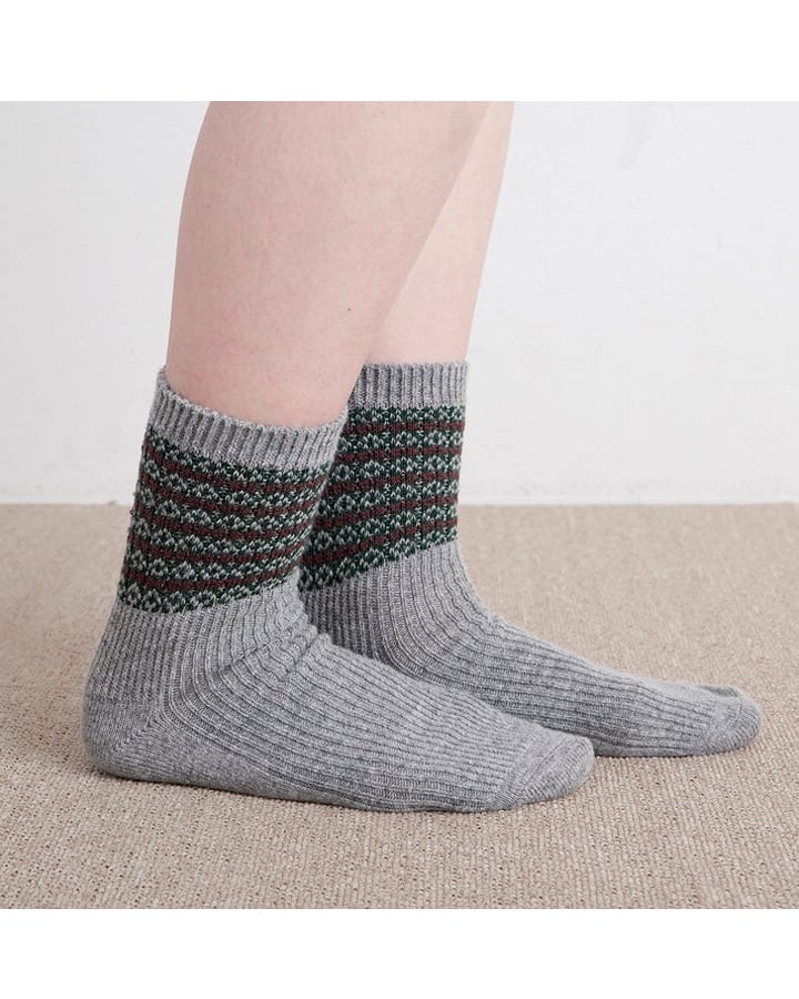 アンクル丈の程よく厚みのあるアクリルウール糸と抗菌防臭を施したコットン糸を引き揃え編み立てた冬のコーディネートにピッタリな1足。