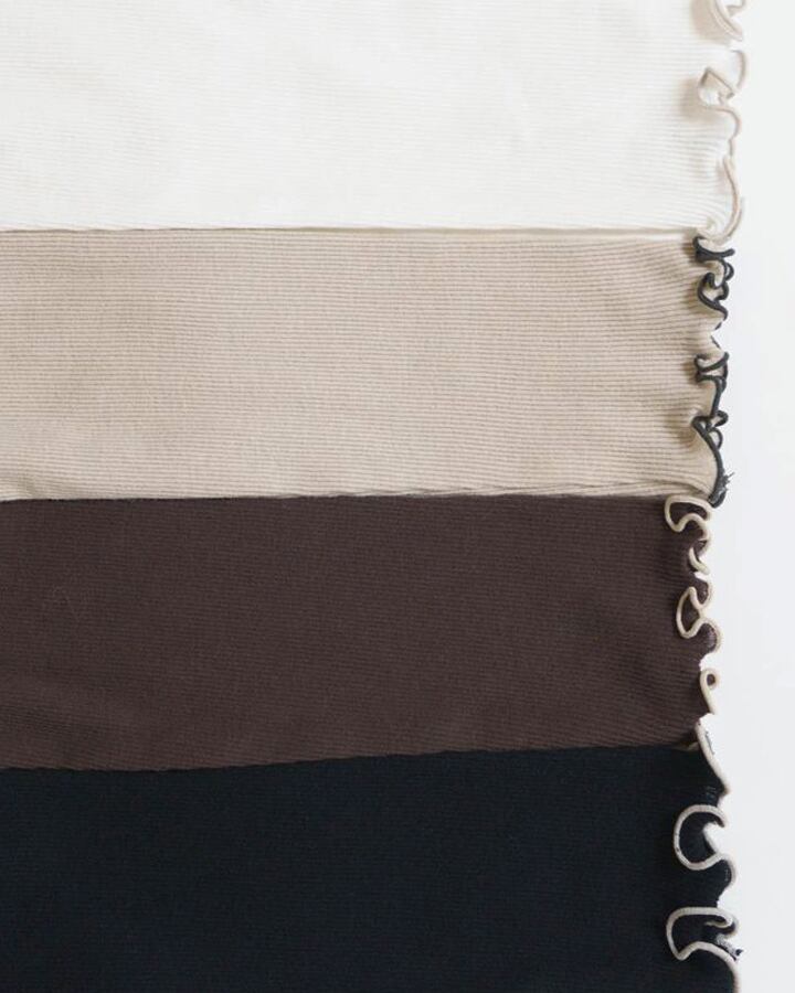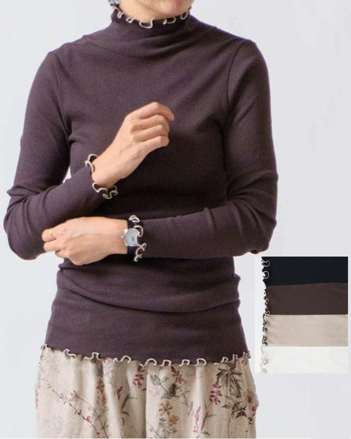 柔らかなコットン100%のテレコ素材を使用し、首元・袖口・裾に施された配色フリルが大人可愛い素敵な1枚です。