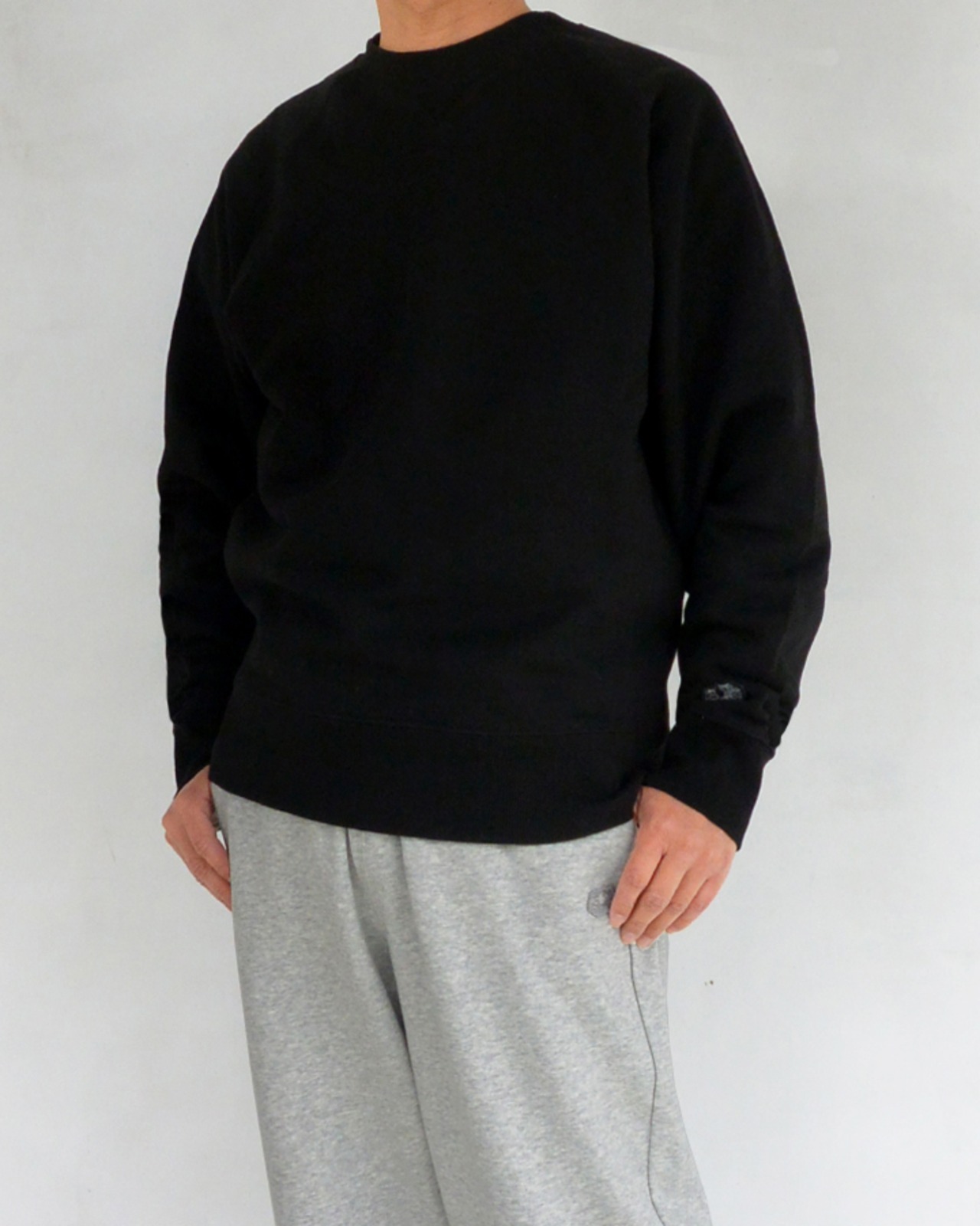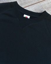 ヴィンテージなスタイルを意識したFRUIT OF THE LOOMの新定番の裏毛シリーズで首元ははめ込み式のV字ガゼット仕様、袖口や裾はリブを長めで、袖口にはボディと同色のフルーツアイコンのワッペンを採用しています。