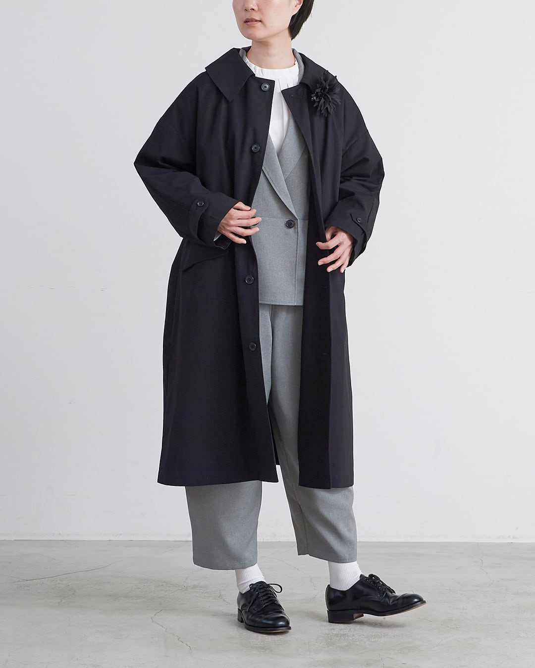 HEAVENLYの姉妹ブランドun cinqのハイカウントツイル ワイドカラーコート