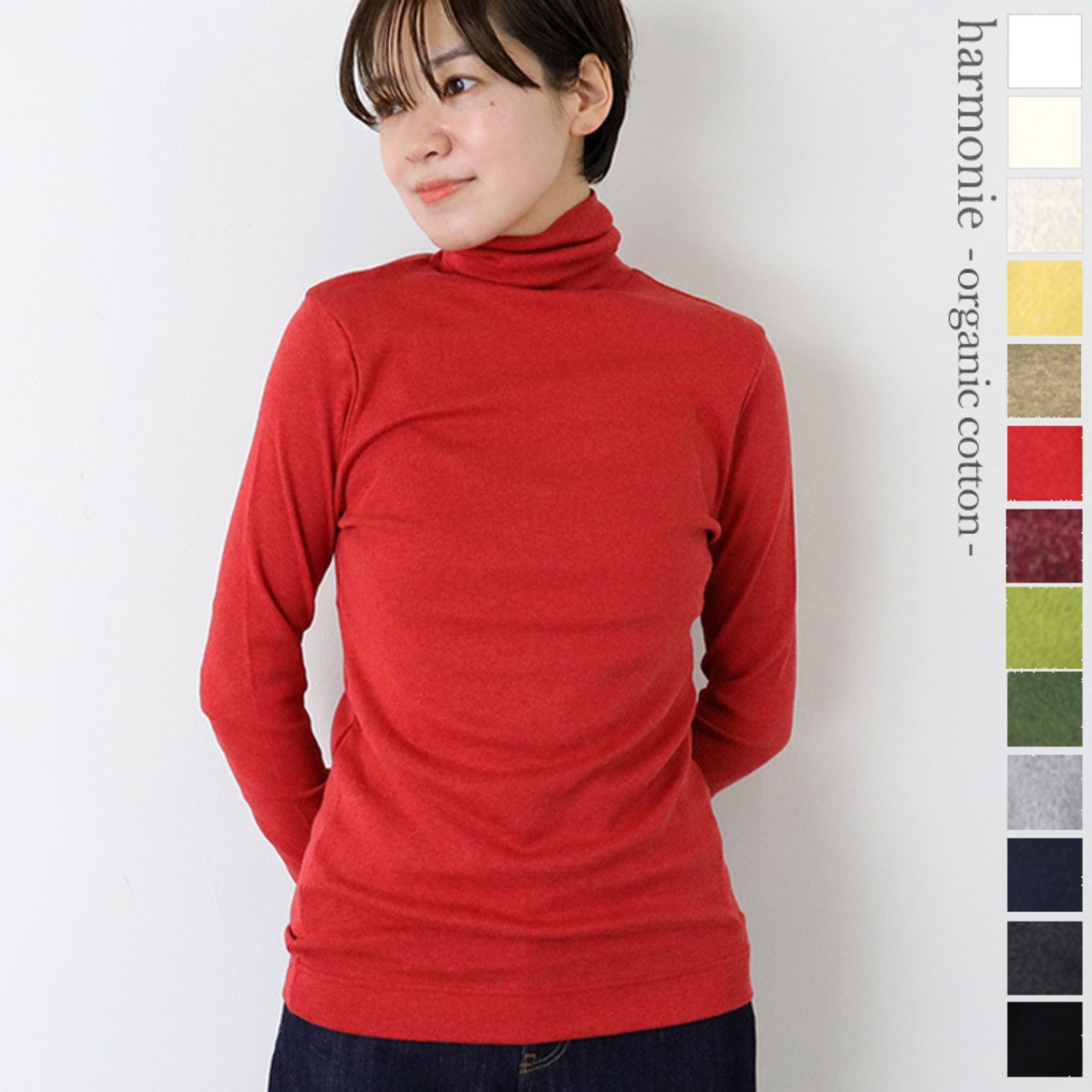harmonieのアイテムの中でも特に人気のオーガニックコットン100%のオリジナル生地を使ったロングスリーブのタートルネック。