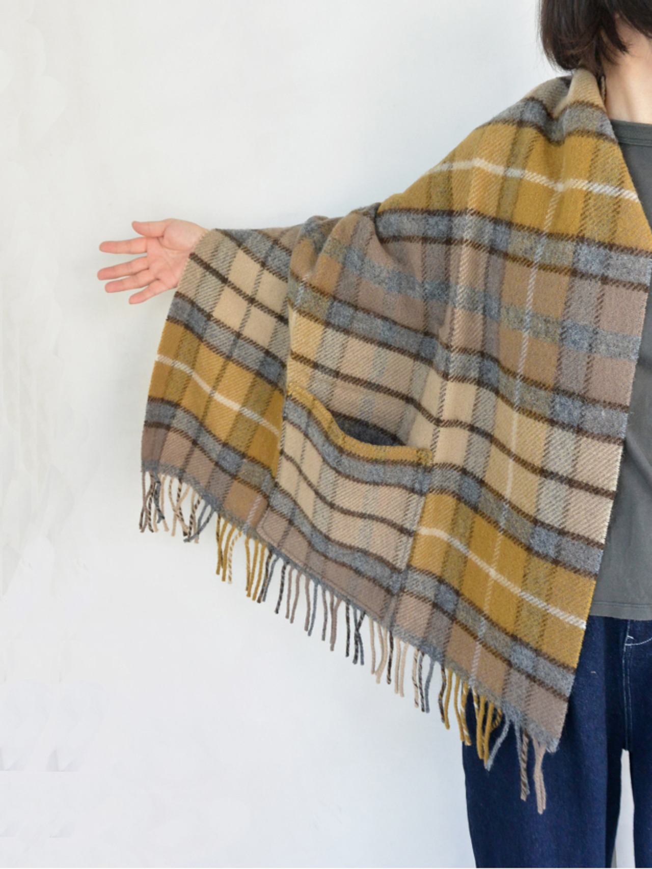 Tweedmill (ツイードミル)ウールブランケット 大判ストール ポケット付き BROWN/CHECK