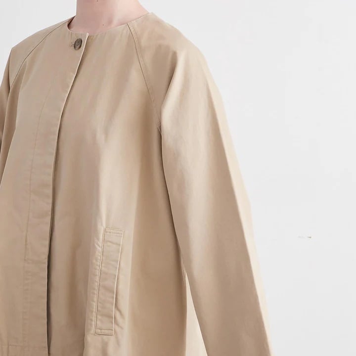 バックスタイルにトレンチコートなどに見られるアンブレラヨークを施した、ショート丈のトレンチコートデザインのジャケット。